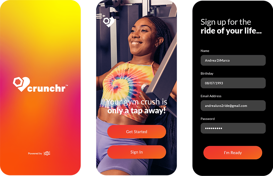 The Crunchr app is a conceptual design project, with the idea of allowing gym-goers to find and match with nearby and local gym partners "Swolemates". This project was used as digital content on all social platforms for Crunch Fitness.